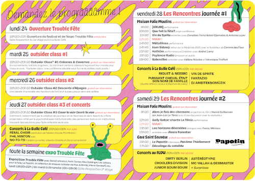 Au programme : expo, discussions, ateliers, concerts, projections, performances, ainsi que 3 soirées Outsider Class en co-programmation avec le LaM, et la participation exceptionnelle du Papotin, journal atypique.